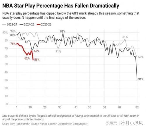 今日,據(jù)記者Tom Haberstroh統(tǒng)計(jì)報(bào)道,本賽季至今球星們(過去三個(gè)賽季入選過全明星或最佳陣容的球員)的缺勤場次已經(jīng)超過了200場,出勤率跌破了六成,只有56%。值得一提的是,去年同期出勤率為67%,前年則是87%。據(jù)統(tǒng)計(jì),本賽季共有45位球員符合球星的定義標(biāo)準(zhǔn),這意味著平均每位球星至少將缺席五場比賽。即便是去掉那些因?yàn)榇髠缇痛_定長期缺席的球星們(比如接受手術(shù)的歐文、塔圖姆等人),明星們的出勤率也只有75%。
